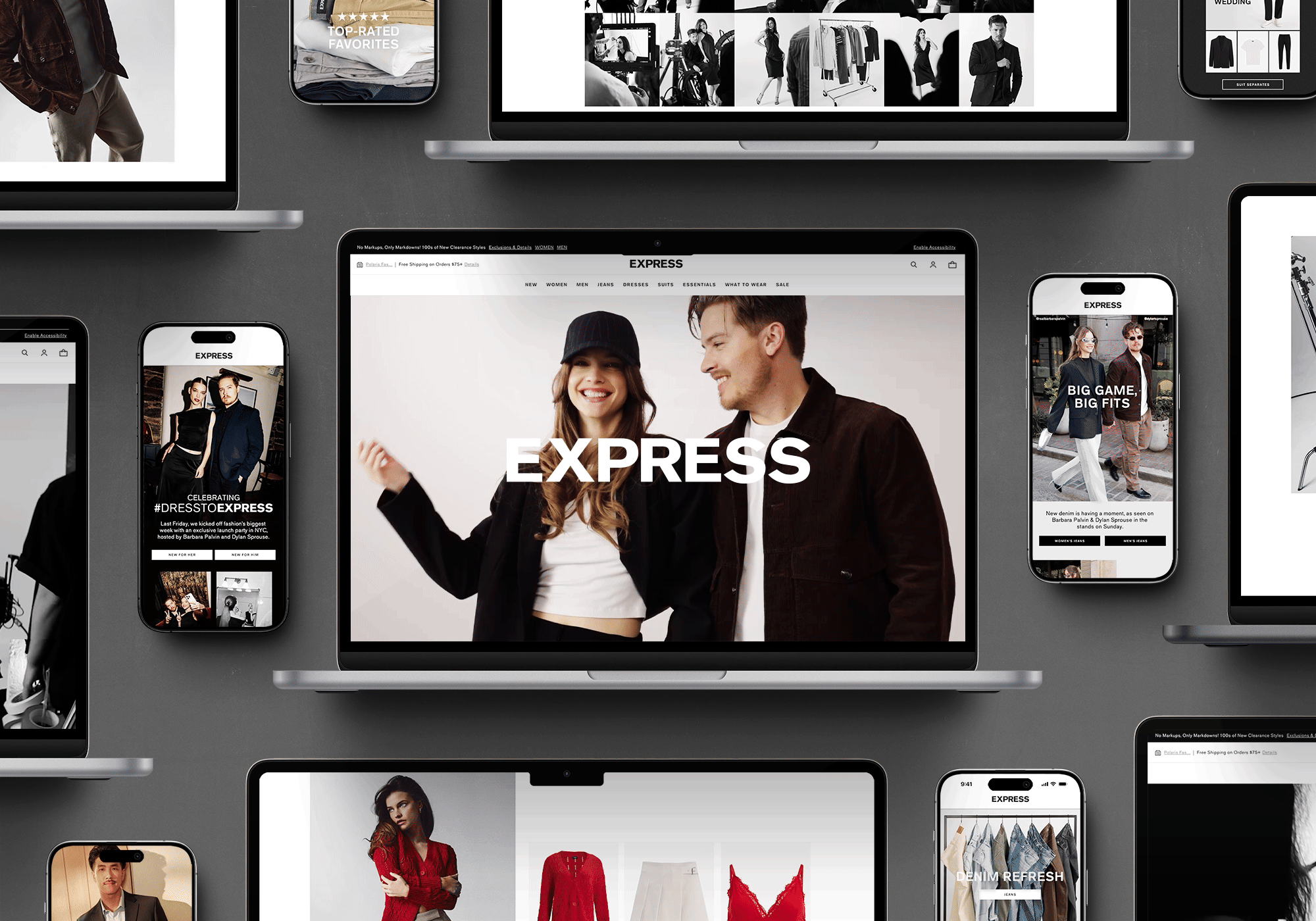 Multiple digital devices displaying the Express fashion website, featuring models in trendy clothing, product pages, and promotions for clothing collections.